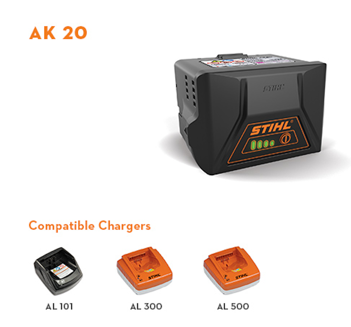 The AK 20 Lithium-Ion Battery gives you the high performance of STIHL in a battery. Part of the STIHL AK Series, the AK 20 is a Lithium-Ion, 36-volt battery that delivers an excellent power-to-weight ratio. The AK 20 weighs only 2.7 lbs. and is excellent for applications with more run time. STIHL batteries are engineered to run the power tool at full speed until they are completely depleted, and there is minimal loss of charge during storage. Indicator lights show the battery charge level so you can plan your productivity accordingly. Inside the battery, sensors monitor temperature and automatically shut down if the battery ever becomes too warm or cold. Check out this and other STIHL batteries at our Dealership today!