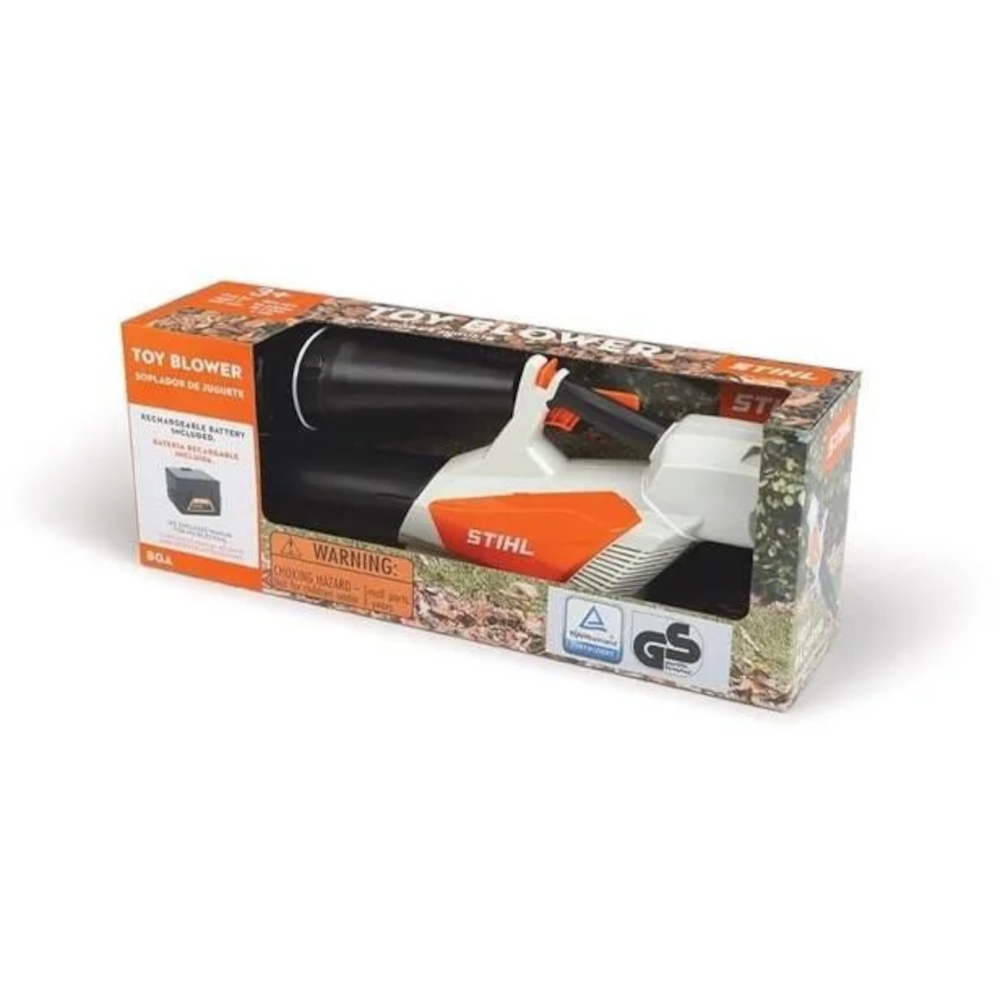 The Stihl Toy leaf blower is modeled after a BGA battery-powered handheld blower. This battery-operated toy features an adjustable blower tube with three settings and a removable/rechargeable Li-on battery with an LED indication meter. The start-stop switch, safety switch, and bolt playfully simulate the operation of a professional device. A USB charging cable is included. It measures 21.25″ – 24.21″ long.