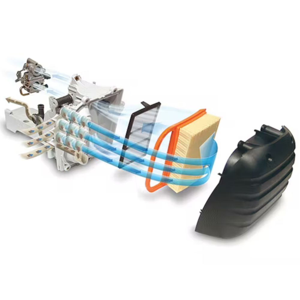 The IntelliCarb™ Compensating Carburetor is designed to adjust the air/fuel ratio automatically when the air filter becomes restricted or partially clogged and maintains the engine’s correct RPM. IntelliCarb™ uses air from the clean side of the air filter to control the diaphragm and flow of fuel. As the air filter becomes dirty and less air is available for the carburetor, the IntelliCarb™ system adjusts the fuel flow to compensate for the decrease in airflow. This is in contrast to typical carburetors that utilize this air from the “dirty” side of the air box. - STIHL ElastoStart™