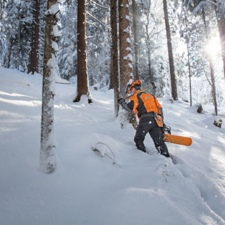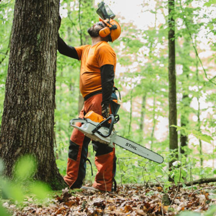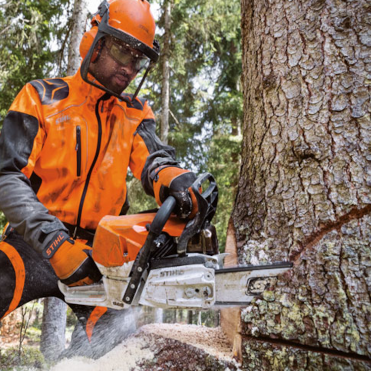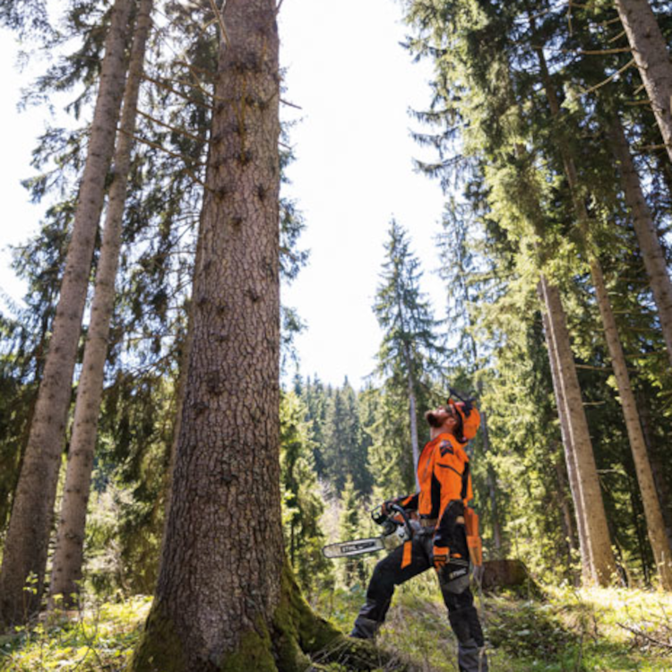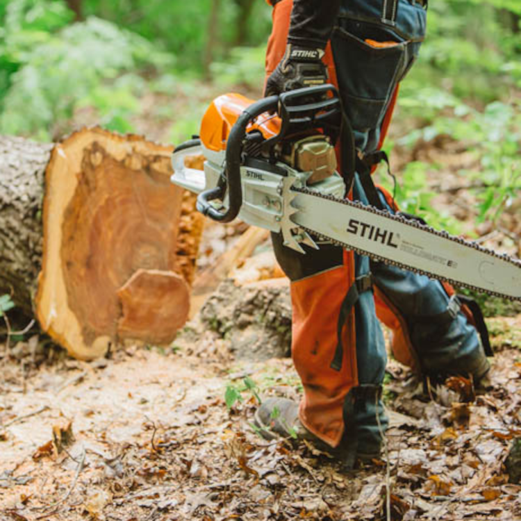 STIHL chainsaws are equipped with a chain stopping system designed to reduce the risk of injury in certain kickback situations. It is called a STIHL Quickstop® chain brake. The STIHL Quickstop® chain brake is designed to stop the rotation of the chain if activated by the operator’s hand or by inertia if the saw kicks back with sufficient force. In some working positions, the STIHL Quickstop® chain brake can be activated by inertia, stopping the chain within fractions of a second.