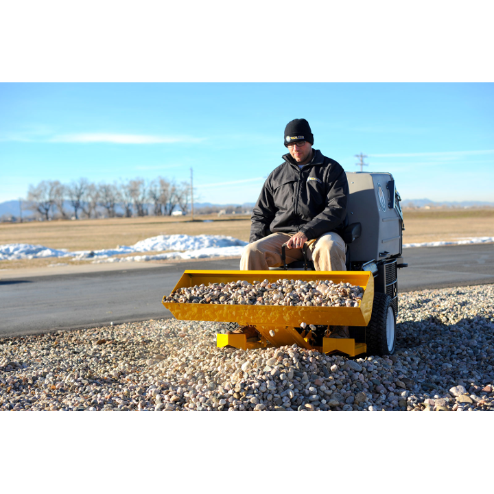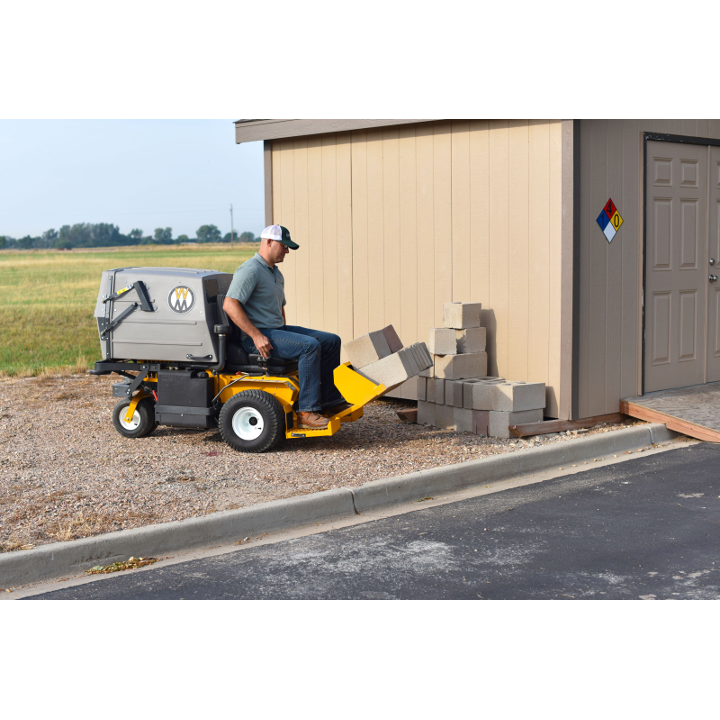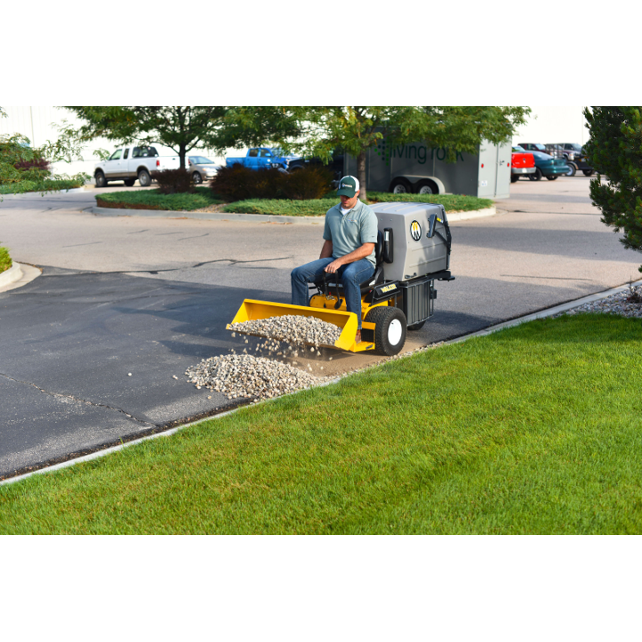 A versatile tool for landscaping work, the Loader Bucket will push, scoop, haul and grade dirt, stone, gravel, and mulch. It lifts approximately 180lb (82kg) and holds 2.25 cu.ft (64 liters) of material, and features 14″ ground clearance for transport. The Loader Bucket has a high-strength steel cutting edge with tilting action, and is powered by a 500-lb electric ram, and is available for use on each Walker Mower except models S, B and H.