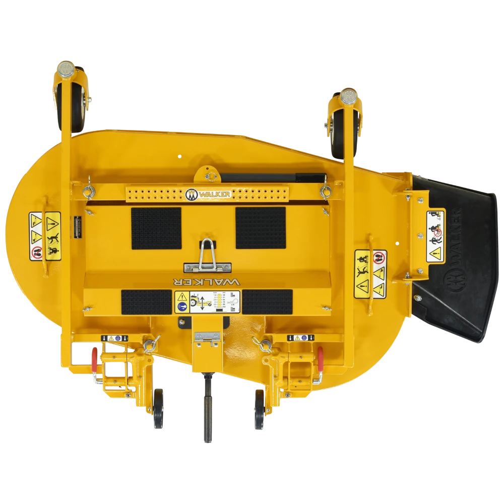 The Walker S48-3 mower deck operates smoothly and quietly, making it suitable for various conditions, including rough field mowing with side discharge. Optional accessories, such as a mulch kit, Accelerator grass catcher, and counter-balance weight kit, are also available. This deck is more forgiving in trashy areas since it does not use shear pins on the blades. Both blades rotate in the same direction and do not physically overlap.